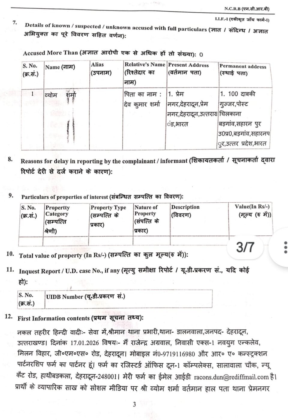 एफआईआर के अनुसार शिकायतकर्ता राजेन्द्र अग्रवाल, जो आर.ए. कंस्ट्रक्शन फर्म के पार्टनर ने आरोप लगाया है कि कुछ समय से व्यौम शर्मा नाम के व्यक्ति द्वारा उन्हें लगातार धमकाया जा रहा है। आरोप है कि व्यौम शर्मा स्वयं को रियल एस्टेट कमीशन एजेंट बताकर सोशल मीडिया प्लेटफॉर्म्स के माध्यम से शिकायतकर्ता और उनकी फर्म की छवि को नुकसान पहुँचाने की कोशिश कर रहा है।
